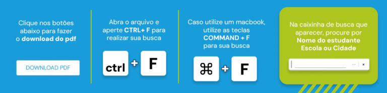 Você pode navegar pela lista dos medalhistas e finalistas em ordem alfabética por categoria (ouro, prata e bronze), utilizando o mecanismo CTRL + F em seu teclado sendo ele Windows ou Commad + F em seu teclado sendo ele MACBOOK, você pode pesquisar pelo seu nome, nome do seu professor representante, escola, cidade ou UF.